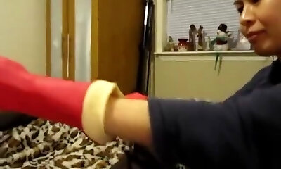 femme de ménage en mitaines de protection jaunes chevauche un faux pénis