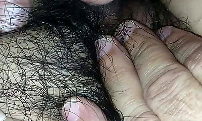 Fingering her super wet hairy pussy point of view