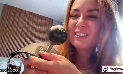 brudna busty redhead zabawia się z uległym przykutym facetem, kopiąc jego jaja i drażniąc jego penisa